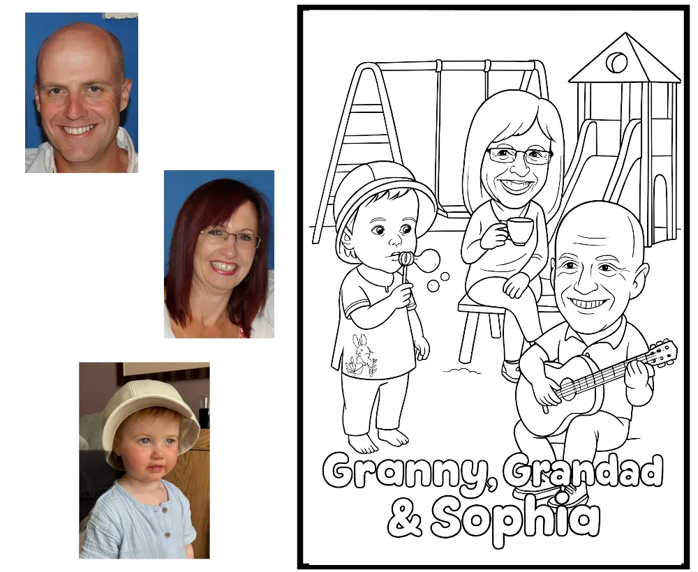 As you can see, I transformed facial photos of the 3 of us into colouring pages where we're all doing something we enjoy.
